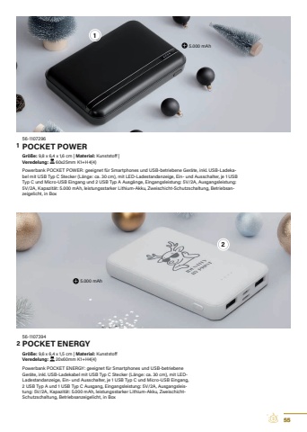 56-1107296POCKET POWERGr%u00f6%u00dfe:%u00a09,8 x 6,4 x 1,6 cm | Material: Kunststoff | Veredelung: %u00a060x25mm K1+H4(4)Powerbank POCKET POWER: geeignet f%u00fcr Smartphones und USB-betriebene Ger%u00e4te, inkl. USB-Ladekabel mit USB Typ C Stecker (L%u00e4nge: ca. 30 cm), mit LED-Ladestandanzeige, Ein- und Ausschalter, je 1 USB Typ C und Micro-USB Eingang und 2 USB Typ A Ausg%u00e4nge, Eingangsleistung: 5V/2A, Ausgangsleistung: 5V/2A, Kapazit%u00e4t: 5.000 mAh, leistungsstarker Lithium-Akku, Zweischicht-Schutzschaltung, Betriebsanzeigelicht, in Box56-1107394POCKET ENERGYGr%u00f6%u00dfe:%u00a09,6 x 6,4 x 1,5 cm | Material: KunststoffVeredelung: %u00a020x60mm K1+H4(4)Powerbank POCKET ENERGY: geeignet f%u00fcr Smartphones und USB-betriebene Ger%u00e4te, inkl. USB-Ladekabel mit USB Typ C Stecker (L%u00e4nge: ca. 30 cm), mit LEDLadestandanzeige, Ein- und Ausschalter, je 1 USB Typ C und Micro-USB Eingang, 2 USB Typ A und 1 USB Typ C Ausgang, Eingangsleistung: 5V/2A, Ausgangsleistung: 5V/2A, Kapazit%u00e4t: 5.000 mAh, leistungsstarker Lithium-Akku, ZweischichtSchutzschaltung, Betriebsanzeigelicht, in Box5.000 mAh5.000 mAh551212