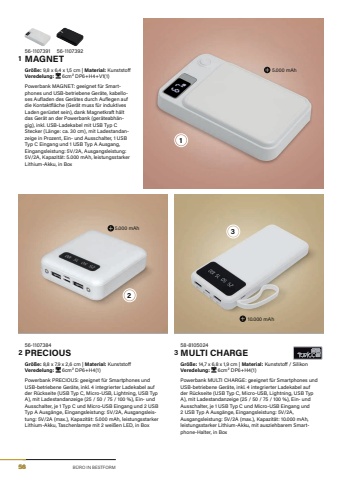 B%u00dcRO IN BESTFORM56-1107384PRECIOUSGr%u00f6%u00dfe:%u00a08,8 x 7,9 x 2,6 cm | Material: KunststoffVeredelung: %u00a06cm%u00b2 DP6+H4(1)Powerbank PRECIOUS: geeignet f%u00fcr Smartphones und USB-betriebene Ger%u00e4te, inkl. 4 integrierter Ladekabel auf der R%u00fcckseite (USB Typ C, Micro-USB, Lightning, USB Typ A), mit Ladestandanzeige (25 / 50 / 75 / 100 %), Ein- und Ausschalter, je 1 Typ C und Micro-USB Eingang und 2 USB Typ A Ausg%u00e4nge, Eingangsleistung: 5V/2A, Ausgangsleistung: 5V/2A (max.), Kapazit%u00e4t: 5.000 mAh, leistungsstarker Lithium-Akku, Taschenlampe mit 2 wei%u00dfen LED, in Box56-1107391MAGNETGr%u00f6%u00dfe:%u00a09,8 x 6,4 x 1,5 cm | Material: KunststoffVeredelung: %u00a06cm%u00b2 DP6+H4+V1(1)Powerbank MAGNET: geeignet f%u00fcr Smartphones und USB-betriebene Ger%u00e4te, kabelloses Aufladen des Ger%u00e4tes durch Auflegen auf die Kontaktfl%u00e4che (Ger%u00e4t muss f%u00fcr induktives Laden ger%u00fcstet sein), dank Magnetkraft h%u00e4lt das Ger%u00e4t an der Powerbank (ger%u00e4teabh%u00e4ngig), inkl. USB-Ladekabel mit USB Typ C Stecker (L%u00e4nge: ca. 30 cm), mit Ladestandanzeige in Prozent, Ein- und Ausschalter, 1 USB Typ C Eingang und 1 USB Typ A Ausgang, Eingangsleistung: 5V/2A, Ausgangsleistung: 5V/2A, Kapazit%u00e4t: 5.000 mAh, leistungsstarker Lithium-Akku, in Box56-11073925.000 mAh58-8105024MULTI CHARGEGr%u00f6%u00dfe:%u00a014,7 x 6,8 x 1,9 cm | Material: Kunststoff / SilikonVeredelung: %u00a06cm%u00b2 DP6+H4(1)Powerbank MULTI CHARGE: geeignet f%u00fcr Smartphones und USB-betriebene Ger%u00e4te, inkl. 4 integrierter Ladekabel auf der R%u00fcckseite (USB Typ C, Micro-USB, Lightning, USB Typ A), mit Ladestandanzeige (25 / 50 / 75 / 100 %), Ein- und Ausschalter, je 1 USB Typ C und Micro-USB Eingang und 2 USB Typ A Ausg%u00e4nge, Eingangsleistung: 5V/2A, Ausgangsleistung: 5V/2A (max.), Kapazit%u00e4t: 10.000 mAh, leistungsstarker Lithium-Akku, mit ausziehbarem Smartphone-Halter, in Box5.000 mAh10.000 mAh56213213