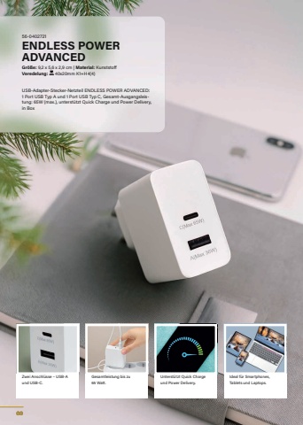 Gesamtleistung bis zu 65%u00a0Watt.Ideal f%u00fcr Smartphones, Tablets und Laptops.Zwei Anschl%u00fcsse %u2013 USB-A und USB-C.Unterst%u00fctzt Quick Charge und Power Delivery.56-0402721ENDLESS POWER ADVANCEDGr%u00f6%u00dfe:%u00a09,2 x 5,6 x 2,9 cm | Material: KunststoffVeredelung: %u00a040x20mm K1+H4(4)USB-Adapter-Stecker-Netzteil ENDLESS POWER ADVANCED: 1 Port USB Typ A und 1 Port USB Typ C, Gesamt-Ausgangsleistung: 65W (max.), unterst%u00fctzt Quick Charge und Power Delivery, in Box60