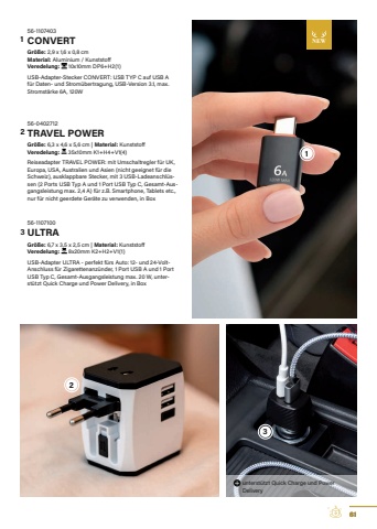 NEW56-1107100ULTRAGr%u00f6%u00dfe:%u00a06,7 x 3,5 x 2,5 cm | Material: KunststoffVeredelung: %u00a08x20mm K2+H2+V1(1)USB-Adapter ULTRA - perfekt f%u00fcrs Auto: 12- und 24-VoltAnschluss f%u00fcr Zigarettenanz%u00fcnder, 1 Port USB A und 1 Port USB Typ C, Gesamt-Ausgangsleistung max. 20 W, unterst%u00fctzt Quick Charge und Power Delivery, in Box56-0402712TRAVEL POWERGr%u00f6%u00dfe:%u00a06,3 x 4,6 x 5,6 cm | Material: KunststoffVeredelung: %u00a035x10mm K1+H4+V1(4)Reiseadapter TRAVEL POWER: mit Umschaltregler f%u00fcr UK, Europa, USA, Australien und Asien (nicht geeignet f%u00fcr die Schweiz), ausklappbare Stecker, mit 3 USB-Ladeanschl%u00fcssen (2 Ports USB Typ A und 1 Port USB Typ C, Gesamt-Ausgangsleistung max. 2,4 A) f%u00fcr z.B. Smartphone, Tablets etc., nur f%u00fcr nicht geerdete Ger%u00e4te zu verwenden, in Box56-1107403CONVERTGr%u00f6%u00dfe:%u00a02,9 x 1,6 x 0,8 cm Material: Aluminium / KunststoffVeredelung: %u00a010x10mm DP6+H2(1) USB-Adapter-Stecker CONVERT: USB TYP C auf USB A f%u00fcr Daten- und Strom%u00fcbertragung, USB-Version 3.1, max. Stromst%u00e4rke 6A, 120Wunterst%u00fctzt Quick Charge und Power Delivery61123123