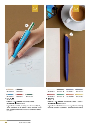 NEW NEWB%u00dcRO IN BESTFORM56-1102270MUCOGr%u00f6%u00dfe:%u00a014,3 cm | Material: Papier / KunststoffVeredelung: %u00a055x8mm K1(4)Kugelschreiber MUCO, vierfarbig: aus Weizenstroh/ABS, Schaft ummantelt mit recyceltem Karton, Druckmechanismus, Kugelschreiberminen in schwarz, rot, blau und gr%u00fcnschreibend56-1102271 56-110227256-1102268 56-110226956-1102278BAPUGr%u00f6%u00dfe:%u00a013,5 cm | Material: recycelter Kunststoff / BambusVeredelung: %u00a060x6mm K1(4)Kugelschreiber BAPU: Geh%u00e4use aus recyceltem Kunststoff, Druckmechanismus, Dr%u00fccker aus Bambus, blauschreibend56-1102284 56-110228556-1102275 56-110227656-110227956-1102273 56-1102274661 212
