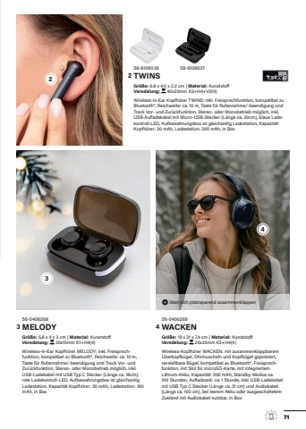 56-0406269WACKENGr%u00f6%u00dfe:%u00a019 x 21 x 7,4 cm | Material: KunststoffVeredelung: %u00a020x30mm K2+H4(4)Wireless-Kopfh%u00f6rer WACKEN: mit zusammenklappbarem %u00dcberkopfb%u00fcgel, Ohrmuscheln und Kopfb%u00fcgel gepolstert, verstellbare B%u00fcgel, kompatibel zu Bluetooth%u00ae, Freisprechfunktion, mit Slot f%u00fcr microSD-Karte, mit integriertem Lithium-Akku, Kapazit%u00e4t: 200 mAh, Standby-Modus ca. 100 Stunden, Aufladezeit: ca. 1 Stunde, inkl. USB-Ladekabel mit USB Typ C Stecker (L%u00e4nge ca. 31 cm) und Audiokabel (L%u00e4nge ca. 100 cm), bei leerem Akku oder ausgeschaltetem Zustand mit Audiokabel nutzbar, in Boxl%u00e4sst sich platzsparend zusammenklappen58-8106036TWINSGr%u00f6%u00dfe:%u00a06.8 x 4.5 x 2.2 cm | Material: KunststoffVeredelung: %u00a040x20mm K2+H4+V2(4)Wireless-In-Ear Kopfh%u00f6rer TWINS: inkl. Freisprechfunktion, kompatibel zu Bluetooth%u00ae, Reichweite: ca. 10 m, Taste f%u00fcr Rufannahme/-beendigung und Track Vor- und Zur%u00fcckfunktion, Stereo- oder Monobetrieb m%u00f6glich, inkl. USB-Aufladekabel mit Micro-USB-Stecker (L%u00e4nge ca. 20cm), blaue Ladekontroll-LED, Aufbewahrungsbox ist gleichzeitig Ladestation, Kapazit%u00e4t Kopfh%u00f6rer: 30 mAh, Ladestation: 300 mAh, in Box58-810603756-0406268MELODYGr%u00f6%u00dfe:%u00a05,8 x 4 x 3 cm | Material: KunststoffVeredelung: %u00a030x15mm K1+H4(4)Wireless-In-Ear Kopfh%u00f6rer MELODY: inkl. Freisprechfunktion, kompatibel zu Bluetooth%u00ae, Reichweite: ca. 10 m, Taste f%u00fcr Rufannahme/-beendigung und Track Vor- und Zur%u00fcckfunktion, Stereo- oder Monobetrieb m%u00f6glich, inkl. USB-Ladekabel mit USB Typ C Stecker (L%u00e4nge ca. 19cm), rote Ladekontroll-LED, Aufbewahrungsbox ist gleichzeitig Ladestation, Kapazit%u00e4t Kopfh%u00f6rer: 30 mAh, Ladestation: 180 mAh, in Box712343 42