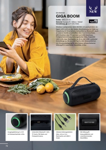 NEWUnterst%u00fctzt Bluetooth%u00ae, AUX, TF-Karte, FM-Radio und Freisprechmodus.Mit Silikongriff, Gravurpl%u00e4ttchen und rutschhemmenden Standf%u00fc%u00dfen.Ausgangsleistung 2 x 5 W mit farbwechselnden LEDs.Inklusive leistungsstarkem Akku, mit ca. 10 m Reichweite und USB-CKabel.58-8106038GIGA BOOMGr%u00f6%u00dfe:%u00a0 %u00d810 x 22 cm Material: Kunststoff / Silikon / MetallVeredelung: %u00a05cm%u00b2 LY5+H8(1)Wireless-Lautsprecher GIGA BOOM: mit wechselndem, farbigem LED-Licht an den Seiten, Musikleistung 2x5 Watt, zur Koppelung mit Smartphone, kompatibel zu Bluetooth%u00ae, auch an externe Ger%u00e4te anschlie%u00dfbar %u00fcber Aux-In-Anschluss, MP3 Funktion %u00fcber TF card slot und USB Anschluss, Freisprecheinrichtung, leistungsstarker Akku, Kapazit%u00e4t: 1.800 mAh, max. Reichweite: ca. 10 m, inkl. USB-Ladekabel (Kabell%u00e4nge ca. 50 cm, USB Typ C), inkl. Gravurpl%u00e4ttchen mit Chromunterlegung f%u00fcr eine Gravur, schwarzfarbener Silikongriff, 2 rutschfeste Standf%u00fc%u00dfe, in Box72
