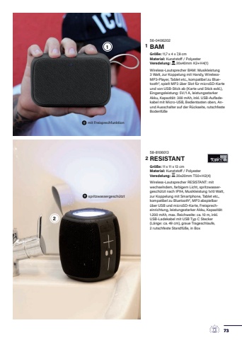 58-8106013RESISTANTGr%u00f6%u00dfe:%u00a011 x 11 x 13 cm Material: Kunststoff / PolyesterVeredelung: %u00a020x20mm T50+H2(4)Wireless-Lautsprecher RESISTANT: mit wechselndem, farbigem Licht, spritzwassergesch%u00fctzt nach IPX4, Musikleistung 1x10 Watt, zur Koppelung mit Smartphone, Tablet etc., kompatibel zu Bluetooth%u00ae, MP3 abspielbar %u00fcber USB und microSD-Karte, Freisprecheinrichtung, leistungsstarker Akku, Kapazit%u00e4t: 1.200 mAh, max. Reichweite: ca. 10 m, inkl. USB-Ladekabel mit USB Typ C Stecker (L%u00e4nge: ca. 49 cm), graue Trageschlaufe, 2 rutschfeste Standf%u00fc%u00dfe, in Box56-0406202BAMGr%u00f6%u00dfe:%u00a011,7 x 4 x 7,8 cm Material: Kunststoff / PolyesterVeredelung: %u00a020x40mm K2+H4(1)Wireless-Lautsprecher BAM: Musikleistung 3 Watt, zur Koppelung mit Handy, WirelessMP3-Player, Tablet etc., kompatibel zu Bluetooth%u00ae, spielt MP3 %u00fcber Slot f%u00fcr microSD-Karte und von USB-Stick ab (Karte und Stick exkl.), Eingangsleistung: 5V/1 A, leistungsstarker Akku, Kapazit%u00e4t: 300 mAh, inkl. USB-Aufladekabel mit Micro-USB, Bedientasten oben, Anund Ausschalter auf der R%u00fcckseite, rutschfeste Bodenf%u00fc%u00dfespritzwassergesch%u00fctztmit Freisprechfunktion731212