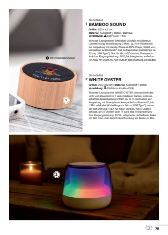 56-0406242BAMBOO SOUNDGr%u00f6%u00dfe:%u00a0%u00d87,3 x 4,2 cm Material: Kunststoff / Metall / BambusVeredelung: %u00a05cm%u00b2 LC5+H4(1)Wireless-Lautsprecher BAMBOO SOUND: mit BambusUmmantelung, Musikleistung 3 Watt, ca. 10 m Reichweite, zur Koppelung mit Handy, Wireless-MP3-Player, Tablet, etc., kompatibel zu Bluetooth%u00ae, inkl. Aufladekabel (Kabell%u00e4nge ca. 50 cm, USB Typ C), Slot f%u00fcr Micro-SD-Karten, Freisprechfunktion, Eingangsleistung: 5V/0,5A, integrierter, aufladbarer Akku mit 300mAh, Anti-Rutsch-Beschichtung am Boden mit Freisprechfunktion56-0406292WHITE OYSTERGr%u00f6%u00dfe:%u00a0%u00d89,5 x 8,2 cm | Material: Kunststoff / MetallVeredelung: %u00a025x30mm K1+H4+V1(4)Wireless-Lautsprecher WHITE OYSTER: farbwechselndes Licht und Dauerlicht in 7 verschiedenen Farben, Licht abschaltbar, Musikleistung 5 Watt, ca. 10 m Reichweite, zur Koppelung mit Smartphone, kompatibel zu Bluetooth%u00ae, inkl. USB-Ladekabel (Kabell%u00e4nge ca. 50 cm, USB Typ C), micro SD slot und USB Typ A f%u00fcr mp3 Funktion, Typ C Ladeanschluss, MP3 Funktion %u00fcber TF card slot, Freisprechfunktion, Eingangsleistung: 5V/1A, integrierter, aufladbarer Akku mit 800 mAh, Anti-Rutsch-Beschichtung am Boden, in Box752211