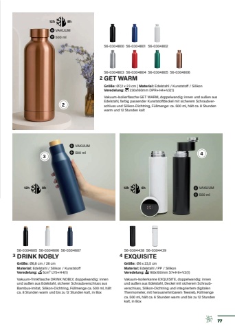 56-0304438EXQUISITEGr%u00f6%u00dfe:%u00a0%u00d86 x 23,5 cmMaterial: Edelstahl / PP / SilikonVeredelung: %u00a0160x100mm S7+H6+V2(1)Vakuum-Isolierkanne EXQUISITE, doppelwandig: innen und au%u00dfen aus Edelstahl, Deckel mit sicherem Schraubverschluss, Silikon-Dichtring und integriertem digitalen Thermometer, mit herausnehmbarem Teesieb, F%u00fcllmenge ca. 500 ml, h%u00e4lt ca. 6 Stunden warm und bis zu 12 Stunden kalt, in Box56-030443912h 6h VAKUUM500 ml56-0304605DRINK NOBLYGr%u00f6%u00dfe:%u00a0%u00d86,8 cm / 26 cmMaterial: Edelstahl / Silikon / KunststoffVeredelung: %u00a05cm%u00b2 LY5+H4(1)Vakuum-Trinkflasche DRINK NOBLY, doppelwandig: innen und au%u00dfen aus Edelstahl, sicherer Schraubverschluss aus Bambus-Imitat, Silikon-Dichtring, F%u00fcllmenge ca. 500 ml, h%u00e4lt ca. 8 Stunden warm und bis zu 12 Stunden kalt, in Box56-0304606 56-030460756-0304803GET WARMGr%u00f6%u00dfe:%u00a0%u00d87,2 x 23 cm | Material: Edelstahl / Kunststoff / SilikonVeredelung: %u00a0230x160mm DPR+H4+V2(1)Vakuum-Isolierflasche GET WARM, doppelwandig: innen und au%u00dfen aus Edelstahl, farbig passender Kunststoffdeckel mit sicherem Schraubverschluss und Silikon-Dichtring, F%u00fcllmenge: ca. 500 ml, h%u00e4lt ca. 8 Stunden warm und 12 Stunden kalt56-0304805 56-030480656-030480256-030480456-0304800 56-0304801VAKUUM500 ml12h 8h12h 8hVAKUUM500 ml7723 43 42