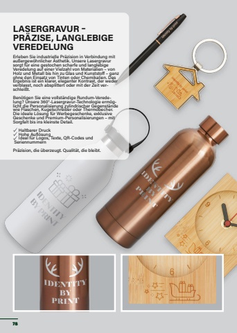 LASERGRAVUR %u2013 PR%u00c4ZISE, LANGLEBIGE VEREDELUNGErleben Sie industrielle Pr%u00e4zision in Verbindung mit au%u00dfergew%u00f6hnlicher %u00c4sthetik. Unsere Lasergravur sorgt f%u00fcr eine gestochen scharfe und langlebige Veredelung auf einer Vielzahl von Materialien %u2013 von Holz und Metall bis hin zu Glas und Kunststoff %u2013 ganz ohne den Einsatz von Tinten oder Chemikalien. Das Ergebnis ist ein klarer, eleganter Kontrast, der weder verblasst, noch absplittert oder mit der Zeit ver- schlei%u00dft.Ben%u00f6tigen Sie eine vollst%u00e4ndige Rundum-Verede- lung? Unsere 360%u00b0-Lasergravur-Technologie erm%u00f6g- licht die Personalisierung zylindrischer Gegenst%u00e4nde wie Flaschen, Kugelschreiber oder Thermobecher. Die ideale L%u00f6sung f%u00fcr Werbegeschenke, exklusive Geschenke und Premium-Personalisierungen %u2013 mit Sorgfalt bis ins kleinste Detail.%u2714 Haltbarer Druck%u2714 Hohe Aufl%u00f6sung %u2714 Ideal f%u00fcr Logos, Texte, QR-Codes und SeriennummernPr%u00e4zision, die %u00fcberzeugt. Qualit%u00e4t, die bleibt.78