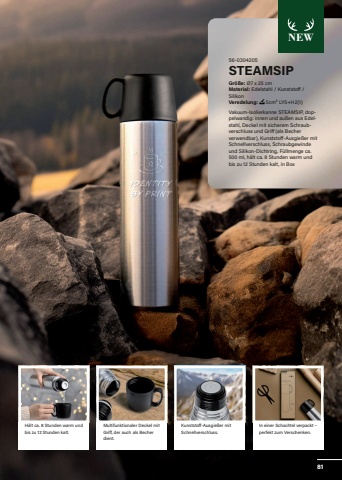 NEW56-0304205STEAMSIPGr%u00f6%u00dfe:%u00a0%u00d87 x 25 cmMaterial: Edelstahl / Kunststoff / SilikonVeredelung: %u00a05cm%u00b2 LY5+H2(1)Vakuum-Isolierkanne STEAMSIP, doppelwandig: innen und au%u00dfen aus Edelstahl, Deckel mit sicherem Schraubverschluss und Griff (als Becher verwendbar), Kunststoff-Ausgie%u00dfer mit Schnellverschluss, Schraubgewinde und Silikon-Dichtring, F%u00fcllmenge ca. 500 ml, h%u00e4lt ca. 8 Stunden warm und bis zu 12 Stunden kalt, in BoxMultifunktionaler Deckel mit Griff, der auch als Becher dient.In einer Schachtel verpackt %u2013 perfekt zum Verschenken.H%u00e4lt ca. 8 Stunden warm und bis zu 12 Stunden kalt.Kunststoff-Ausgie%u00dfer mit Schnellverschluss.81