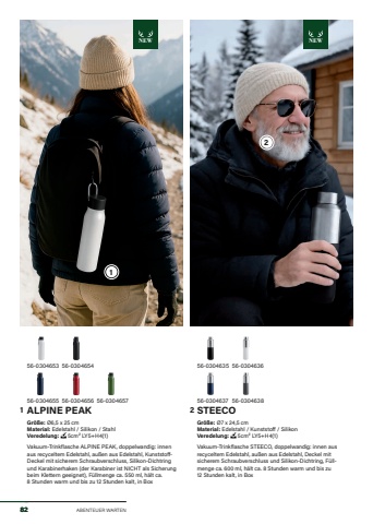 NEW NEWABENTEUER WARTEN56-0304655ALPINE PEAKGr%u00f6%u00dfe:%u00a0%u00d86,5 x 25 cmMaterial: Edelstahl / Silikon / StahlVeredelung: %u00a05cm%u00b2 LY5+H4(1)Vakuum-Trinkflasche ALPINE PEAK, doppelwandig: innen aus recyceltem Edelstahl, au%u00dfen aus Edelstahl, KunststoffDeckel mit sicherem Schraubverschluss, Silikon-Dichtring und Karabinerhaken (der Karabiner ist NICHT als Sicherung beim Klettern geeignet), F%u00fcllmenge ca. 550 ml, h%u00e4lt ca. 8 Stunden warm und bis zu 12 Stunden kalt, in Box56-0304637STEECOGr%u00f6%u00dfe:%u00a0%u00d87 x 24,5 cmMaterial: Edelstahl / Kunststoff / SilikonVeredelung: %u00a05cm%u00b2 LY5+H4(1)Vakuum-Trinkflasche STEECO, doppelwandig: innen aus recyceltem Edelstahl, au%u00dfen aus Edelstahl, Deckel mit sicherem Schraubverschluss und Silikon-Dichtring, F%u00fcllmenge ca. 600 ml, h%u00e4lt ca. 8 Stunden warm und bis zu 12 Stunden kalt, in Box56-030463656-030463856-030463556-030465756-030465456-030465656-0304653821 212