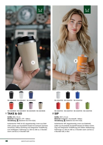 NEW NEWABENTEUER WARTEN56-0304643TAKE & GOGr%u00f6%u00dfe:%u00a0%u00d89 x 15 cmMaterial: Edelstahl / PP / SilikonVeredelung: %u00a030x25mm K2+H4+V2(4)Isolierbecher TAKE & GO, doppelwandig: innen aus Edelstahl, aussen aus Kunststoff, Deckel mit sicherem Schraubverschluss, Silikon-Dichtring und integrierter Trink%u00f6ffnung zum Aufklappen, F%u00fcllmenge ca. 350 ml, h%u00e4lt ca. 2 Stunden warm und bis zu 4 Stunden kalt56-0304723SIPGr%u00f6%u00dfe:%u00a0%u00d87,7 x 13 cmMaterial: Edelstahl / Kunststoff / SilikonVeredelung: %u00a020x60mm K2+H4+V1(4)Isolierbecher SIP, doppelwandig: innen aus Edelstahl, au%u00dfen aus Kunststoff, Kunststoff-Deckel mit Silikon-Dichtring und integrierter Trink%u00f6ffnung (mit Silikon-Abdeckung), F%u00fcllmenge ca. 350 ml, h%u00e4lt ca. 2 Stunden warm und bis zu 4 Stunden kalt, in Box56-0304645 56-030464656-0304641 56-030464256-030464456-030464056-0304725 56-030472656-030472256-030472456-0304720 56-0304721861 212