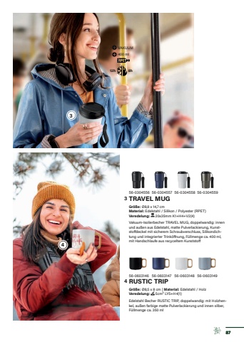 56-0304556TRAVEL MUGGr%u00f6%u00dfe:%u00a0%u00d88,8 x 14,7 cmMaterial: Edelstahl / Silikon / Polyester (RPET)Veredelung: %u00a020x35mm K1+H4+V2(4)Vakuum-Isolierbecher TRAVEL MUG, doppelwandig: innen und au%u00dfen aus Edelstahl, matte Pulverlackierung, Kunststoffdeckel mit sicherem Schraubverschluss, Silikondichtung und integrierter Trink%u00f6ffnung, F%u00fcllmenge ca. 400 ml, mit Handschlaufe aus recyceltem Kunststoff56-0603146RUSTIC TRIPGr%u00f6%u00dfe:%u00a0%u00d88,5 x 8 cm | Material: Edelstahl / HolzVeredelung: %u00a05cm%u00b2 LY5+H4(1)Edelstahl Becher RUSTIC TRIP, doppelwandig: mit Holzhenkel, au%u00dfen farbige matte Pulverlackierung und innen silber, F%u00fcllmenge ca. 350 ml12h 8hVAKUUM400 ml56-0304557 56-0304558 56-030455956-0603147 56-0603148 56-0603149873434