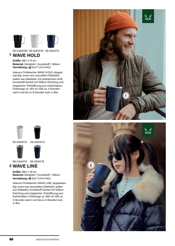 NEWNEWABENTEUER WARTEN56-0304714WAVE LINEGr%u00f6%u00dfe:%u00a0%u00d88,7 x 18 cmMaterial: Edelstahl / Kunststoff / SilikonVeredelung: %u00a05cm%u00b2 LY5+H4(1)Vakuum-Trinkbecher WAVE LINE, doppelwandig: innen aus recyceltem Edelstahl, au%u00dfen aus Edelstahl, Kunststoff-Deckel mit SilikonDichtring und integrierter Trink%u00f6ffnung zum Aufschieben, F%u00fcllmenge ca. 600 ml, h%u00e4lt ca. 4 Stunden warm und bis zu 8 Stunden kalt, in Box56-030471556-0304712 56-030471356-0304709WAVE HOLDGr%u00f6%u00dfe:%u00a0%u00d88,7 x 14 cmMaterial: Edelstahl / Kunststoff / SilikonVeredelung: %u00a05cm%u00b2 LY5+H4(1)Vakuum-Trinkbecher WAVE HOLD, doppelwandig: innen aus recyceltem Edelstahl, au%u00dfen aus Edelstahl, mit praktischem Griff, Kunststoff-Deckel mit Silikon-Dichtring und integrierter Trink%u00f6ffnung zum Aufschieben, F%u00fcllmenge ca. 450 ml, h%u00e4lt ca. 4 Stunden warm und bis zu 8 Stunden kalt, in Box56-0304710 56-03047118812 21