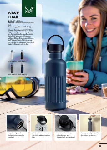 NEWH%u00e4lt Getr%u00e4nke ca. 8 Stunden warm und bis zu 12 Stunden kalt.Fassungsverm%u00f6gen ideal f%u00fcr den Alltag %u2013 ca. 500 ml.Doppelwandig %u2013 au%u00dfen Edelstahl, innen recycelter Edelstahl.Praktischer Deckel mit Silikondichtung und Trageschlaufe aus Kunststoff.56-0304716WAVE TRAILGr%u00f6%u00dfe:%u00a0%u00d87 x 22,5 cm Material: Edelstahl / Silikon / KunststoffVeredelung: %u00a05cm%u00b2 LY5+H4(1)Vakuum-Trinkflasche WAVE TRAIL, doppelwandig: innen aus recyceltem Edelstahl, au%u00dfen aus Edelstahl, Deckel mit sicherem Schraubverschluss, Silikon-Dichtring und Kunststoff-Trageschlaufe, F%u00fcllmenge ca. 500 ml, h%u00e4lt ca. 8 Stunden warm und bis zu 12 Stunden kalt, in Box56-0304718 56-030471956-030471712h 8h89