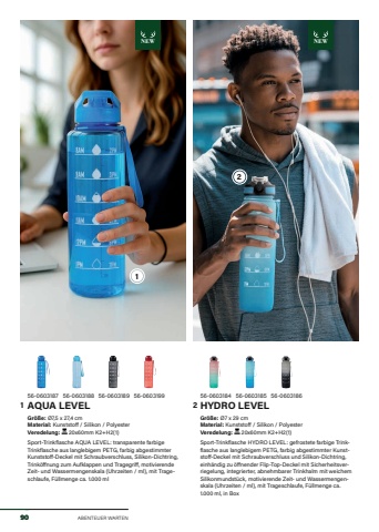 NEW NEWABENTEUER WARTEN56-0603187AQUA LEVELGr%u00f6%u00dfe:%u00a0%u00d87,5 x 27,4 cm Material: Kunststoff / Silikon / PolyesterVeredelung: %u00a020x60mm K2+H2(1)Sport-Trinkflasche AQUA LEVEL: transparente farbige Trinkflasche aus langlebigem PETG, farbig abgestimmter Kunststoff-Deckel mit Schraubverschluss, Silikon-Dichtring, Trink%u00f6ffnung zum Aufklappen und Tragegriff, motivierende Zeit- und Wassermengenskala (Uhrzeiten / ml), mit Trageschlaufe, F%u00fcllmenge ca. 1.000 ml56-0603184HYDRO LEVELGr%u00f6%u00dfe:%u00a0%u00d87 x 29 cmMaterial: Kunststoff / Silikon / PolyesterVeredelung: %u00a020x60mm K2+H2(1)Sport-Trinkflasche HYDRO LEVEL: gefrostete farbige Trinkflasche aus langlebigem PETG, farbig abgestimmter Kunststoff-Deckel mit Schraubverschluss und Silikon-Dichtring, einh%u00e4ndig zu %u00f6ffnender Flip-Top-Deckel mit Sicherheitsverriegelung, integrierter, abnehmbarer Trinkhalm mit weichem Silikonmundst%u00fcck, motivierende Zeit- und Wassermengenskala (Uhrzeiten / ml), mit Trageschlaufe, F%u00fcllmenge ca. 1.000 ml, in Box56-0603188 56-0603189 56-0603199 56-0603185 56-0603186901 212
