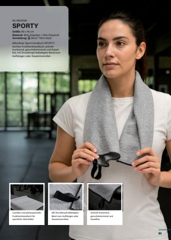 Mit Druckknopf befestigtes Band zum Aufh%u00e4ngen oder Zusammenrollen.Leichtes und platzsparendes Funktionshandtuch f%u00fcr sportliche Aktivit%u00e4ten.Schnell-trocknend, geruchshemmend und fusselfrei.56-0605090SPORTYGr%u00f6%u00dfe:%u00a080 x 40 cmMaterial: 80% Polyester / 20% PolyamidVeredelung: %u00a050cm%u00b2 T50+H2(4)Mikrofaser Sport-Handtuch SPORTY: leichtes Funktionshandtuch, schnelltrocknend, geruchshemmend und fusselfrei, mit Druckknopf befestigtes Band zum Aufh%u00e4ngen oder Zusammenrollen91