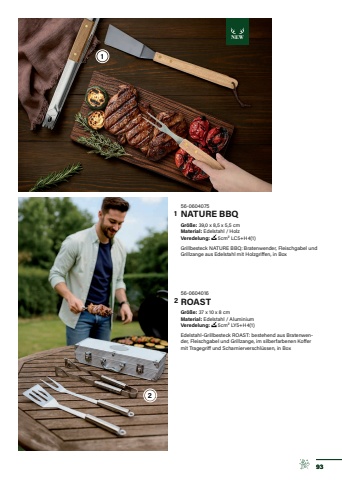 NEW56-0604075NATURE BBQGr%u00f6%u00dfe:%u00a039,0 x 8,5 x 5,5 cmMaterial: Edelstahl / HolzVeredelung: %u00a05cm%u00b2 LC5+H4(1)Grillbesteck NATURE BBQ: Bratenwender, Fleischgabel und Grillzange aus Edelstahl mit Holzgriffen, in Box56-0604016ROASTGr%u00f6%u00dfe:%u00a037 x 10 x 8 cmMaterial: Edelstahl / AluminiumVeredelung: %u00a05cm%u00b2 LY5+H4(1)Edelstahl-Grillbesteck ROAST: bestehend aus Bratenwender, Fleischgabel und Grillzange, im silberfarbenen Koffer mit Tragegriff und Scharnierverschl%u00fcssen, in Box931212