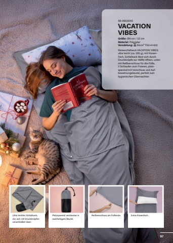 56-0603540VACATION VIBESGr%u00f6%u00dfe:%u00a0%u00d89 cm / 22 cmMaterial: PolyesterVeredelung: %u00a050cm%u00b2 T50+H4(4)Reiseschlafsack VACATION VIBES: ultra leicht (ca. 355 g), mit KissenFach, Schlafsack l%u00e4sst sich durch Druckkn%u00f6pfe zur H%u00e4lfte %u00f6ffnen, unten mit Rei%u00dfverschluss f%u00fcr die F%u00fc%u00dfe, 2 Schlaufen zum Fixieren, platzsparend mit Verschluss und Aufbewahrungsbeutel, perfekt zum hygienischen %u00dcbernachtenPlatzsparend verstaubar in zweifarbigem Beutel.Ultra leichter Schlafsack, Extra Kissenfach.der sich mit Druckkn%u00f6pfen verschlie%u00dfen l%u00e4sst.Rei%u00dfverschluss am Fu%u00dfende.97