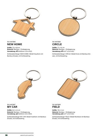 ABENTEUER WARTEN56-0407866NEW HOMEGr%u00f6%u00dfe:%u00a07,2 x 4,8 cmMaterial: Bambus / ZinklegierungVeredelung: %u00a025x20mm LC5+H2(1)Schl%u00fcsselanh%u00e4nger NEW HOME: Metall-Hausform mit Bambus-Einsatz, mit Schl%u00fcsselring56-0407867MY CARGr%u00f6%u00dfe:%u00a08,3 x 2,4 cmMaterial: Bambus / ZinklegierungVeredelung: %u00a010x20mm LC5+H2(1)Schl%u00fcsselanh%u00e4nger MY CAR: Metall-Autoform mit BambusEinsatz, mit Schl%u00fcsselring56-0407869FIELDGr%u00f6%u00dfe:%u00a07,8 x 3 cmMaterial: Bambus / ZinklegierungVeredelung: %u00a05cm%u00b2 LC5+H2(1)Schl%u00fcsselanh%u00e4nger FIELD: Metall-Rechteck mit BambusEinsatz, mit Schl%u00fcsselring56-0407868CIRCLEGr%u00f6%u00dfe:%u00a07,7 x 4,1 cm Material: Bambus / ZinklegierungVeredelung: %u00a05cm%u00b2 LC5+H2(1)Schl%u00fcsselanh%u00e4nger CIRCLE: Metall-Kreis mit Bambus-Einsatz, mit Schl%u00fcsselring98