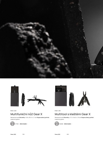 100P221.221Multifunk%u010dn%u00ed n%u016f%u017e Gear XNerezov%u00e1 ocel Rozm%u011bry: 9,8 x 20,5 x 1,7 cm Doporu%u010den%u00fd potisk:Laserov%u00fd grav%u00edr1.77 KG%u0009 BENCHMARK: -Cena (K%u010d) 390 P221.251Multitool s kle%u0161t%u011bmi Gear XNerezov%u00e1 ocel Rozm%u011bry: 11,7 x 34,5 x 1,9 cm Doporu%u010den%u00fd potisk:Laserov%u00fd grav%u00edr3.08 KG%u0009 BENCHMARK: -Cena (K%u010d) 820