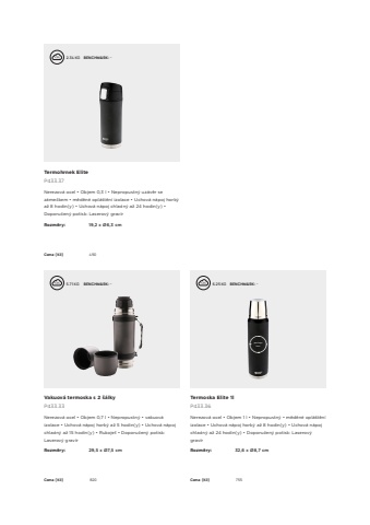 105your logo hereTermohrnek EliteP433.37Nerezov%u00e1 ocel %u2022 Objem 0,3 l %u2022 Nepropustn%u00fd uz%u00e1v%u011br se z%u00e1me%u010dkem %u2022 m%u011bd%u011bn%u00e9 opl%u00e1%u0161t%u011bn%u00ed izolace %u2022 Uchov%u00e1 n%u00e1poj hork%u00fd a%u017e 8 hodin(y) %u2022 Uchov%u00e1 n%u00e1poj chladn%u00fd a%u017e 24 hodin(y) %u2022 Doporu%u010den%u00fd potisk: Laserov%u00fd grav%u00edrRozm%u011bry: 19,2 x %u00d86,3 cmCena (K%u010d) 490 2.34 KG %u0009 BENCHMARK: -Vakuov%u00e1 termoska s 2 %u0161%u00e1lkyP433.33Nerezov%u00e1 ocel %u2022 Objem 0,7 l %u2022 Nepropustn%u00fd %u2022 vakuov%u00e1 izolace %u2022 Uchov%u00e1 n%u00e1poj hork%u00fd a%u017e 5 hodin(y) %u2022 Uchov%u00e1 n%u00e1poj chladn%u00fd a%u017e 15 hodin(y) %u2022 Rukoje%u0165 %u2022 Doporu%u010den%u00fd potisk: Laserov%u00fd grav%u00edrRozm%u011bry: 29,5 x %u00d87,5 cmCena (K%u010d) 820 5.71 KG %u0009 BENCHMARK: -Termoska Elite 1lP433.36Nerezov%u00e1 ocel %u2022 Objem 1 l %u2022 Nepropustn%u00fd %u2022 m%u011bd%u011bn%u00e9 opl%u00e1%u0161t%u011bn%u00ed izolace %u2022 Uchov%u00e1 n%u00e1poj hork%u00fd a%u017e 8 hodin(y) %u2022 Uchov%u00e1 n%u00e1poj chladn%u00fd a%u017e 24 hodin(y) %u2022 Doporu%u010den%u00fd potisk: Laserov%u00fd grav%u00edrRozm%u011bry: 32,6 x %u00d88,7 cmCena (K%u010d) 755 6.25 KG %u0009 BENCHMARK: -