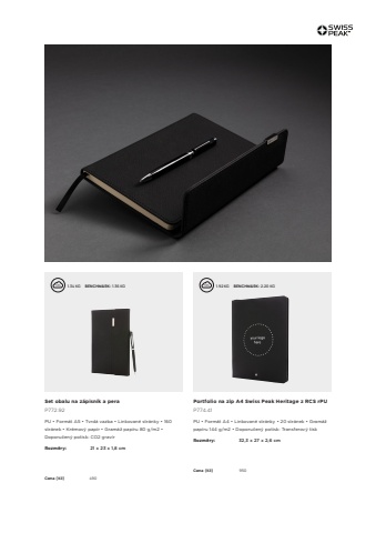 115Set obalu na z%u00e1pisn%u00edk a peraP772.92PU %u2022 Form%u00e1t A5 %u2022 Tvrd%u00e1 vazba %u2022 Linkovan%u00e9 str%u00e1nky %u2022 160 str%u00e1nek %u2022 Kr%u00e9mov%u00fd pap%u00edr %u2022 Gram%u00e1%u017e pap%u00edru 80 g/m2 %u2022 Doporu%u010den%u00fd potisk: CO2 grav%u00edrRozm%u011bry: 21 x 23 x 1,8 cmCena (K%u010d) 490 1.34 KG %u0009 BENCHMARK: 1.36 KGPortfolio na zip A4 Swiss Peak Heritage z RCS rPUP774.41PU %u2022 Form%u00e1t A4 %u2022 Linkovan%u00e9 str%u00e1nky %u2022 20 str%u00e1nek %u2022 Gram%u00e1%u017e pap%u00edru 144 g/m2 %u2022 Doporu%u010den%u00fd potisk: Transferov%u00fd tiskRozm%u011bry: 32,3 x 27 x 2,6 cmCena (K%u010d) 950 1.92 KG %u0009 BENCHMARK: 2.20 KG