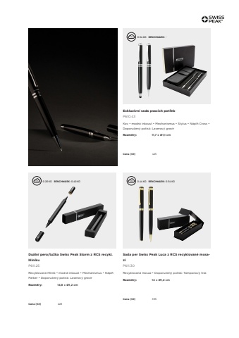 117Sada per Swiss Peak Luca z RCS recyklovan%u00e9 mosaziP611.30Recyklovan%u00e1 mosaz %u2022 Doporu%u010den%u00fd potisk: Tamponov%u00fd tiskRozm%u011bry: 14 x %u00d81,2 cmCena (K%u010d) 395 0.44 KG %u0009 BENCHMARK: 0.54 KGExkluzivn%u00ed sada psac%u00edch pot%u0159ebP610.43Kov %u2022 modr%u00e1 inkoust %u2022 Mechanismus %u2022 Stylus %u2022 N%u00e1pl%u0148 Cross %u2022 Doporu%u010den%u00fd potisk: Laserov%u00fd grav%u00edrRozm%u011bry: 11,7 x %u00d81,1 cmCena (K%u010d) 425 0.54 KG %u0009 BENCHMARK: -Du%u00e1ln%u00ed pero/tu%u017eka Swiss Peak Storm z RCS recykl. hlin%u00edkuP611.25Recyklovan%u00e1 Hlin%u00edk %u2022 modr%u00e1 inkoust %u2022 Mechanismus %u2022 N%u00e1pl%u0148 Parker %u2022 Doporu%u010den%u00fd potisk: Laserov%u00fd grav%u00edrRozm%u011bry: 14,8 x %u00d81,2 cmCena (K%u010d) 228 0.20 KG %u0009 BENCHMARK: 0.40 KG