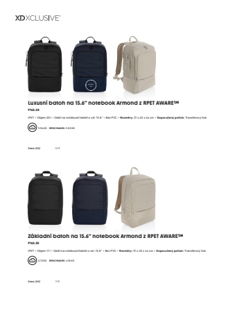 120your logo hereLuxusn%u00ed batoh na 15.6%u201d notebook Armond z RPET AWARE%u2122P763.28rPET %u2022 Objem 20 l %u2022 Odd%u00edl na notebook/tablet o vel. 15,6%u201d %u2022 Bez PVC %u2022 Rozm%u011bry: 31 x 40 x 44 cm %u2022 Doporu%u010den%u00fd potisk: Transferov%u00fd tisk3.94 KG %u0009 BENCHMARK: 5.65 KGCena (K%u010d) 1475 Z%u00e1kladn%u00ed batoh na 15.6%u201d notebook Armond z RPET AWARE%u2122P763.30rPET %u2022 Objem 17 l %u2022 Odd%u00edl na notebook/tablet o vel. 15,6%u201d %u2022 Bez PVC %u2022 Rozm%u011bry: 31 x 40 x 44 cm %u2022 Doporu%u010den%u00fd potisk: Transferov%u00fd tisk2.72 KG %u0009 BENCHMARK: 4.16 KGCena (K%u010d) 1115