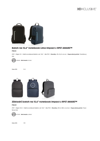 123your logo hereBatoh na 15.6%u201d notebook Lima Impact z RPET AWARE%u2122P763.15rPET %u2022 Objem 15 l %u2022 Odd%u00edl na notebook/tablet o vel. 15,6%u201d %u2022 Bez PVC %u2022 Rozm%u011bry: 33 x 34,5 x 44 cm %u2022 Doporu%u010den%u00fd potisk: Transferov%u00fd tisk3.39 KG %u0009 BENCHMARK: 5.11 KGCena (K%u010d) 1640 Z%u00e1kladn%u00ed batoh na 15.6%u201d notebook Impact z RPET AWARE%u2122P762.01rPET %u2022 Objem 15,5 l %u2022 Odd%u00edl na notebook/tablet o vel. 15,6%u201d %u2022 Bez PVC %u2022 Rozm%u011bry: 30,5 x 38,5 x 44,5 cm %u2022 Doporu%u010den%u00fd potisk: Transferov%u00fd tisk2.77 KG %u0009 BENCHMARK: 4.19 KGCena (K%u010d) 980