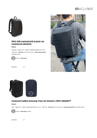 125your logo hereCestovn%u00ed ta%u0161ka Armong Free On Board z RPET AWARE%u2122P763.47rPET %u2022 Objem 19 l %u2022 Odd%u00edl na notebook/tablet o vel. 15%u201d %u2022 Bez PVC %u2022 Rozm%u011bry: 25 x 40 x 40 cm %u2022 Doporu%u010den%u00fd potisk: Transferov%u00fd tisk2.49 KG %u0009 BENCHMARK: 3.58 KGCena (K%u010d) 1145 RFID USB nedobytn%u00fd batoh na notebook MadridP762.51Polyester %u2022 Objem 20 l %u2022 Odd%u00edl na notebook/tablet o vel. 15,6%u201d %u2022 Bez PVC %u2022 Rozm%u011bry: 30 x 35 x 45,5 cm %u2022 Doporu%u010den%u00fd potisk:Transferov%u00fd tisk4.57 KG %u0009 BENCHMARK: -Cena (K%u010d) 1475