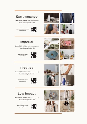 1 3ImperialCena: 84,95 EUR bez DPH (v%u010detn%u011b dopravy)Po%u010det d%u00e1rk%u016f: p%u0159ibli%u017en%u011b 150ExtravaganceCena: 64,95 EUR bez DPH (v%u010detn%u011b dopravy)Po%u010det d%u00e1rk%u016f: p%u0159ibli%u017en%u011b 200PrestigeCena: 128,95 EUR bez DPH (v%u010detn%u011b dopravy)Po%u010det d%u00e1rk%u016f: p%u0159ibli%u017en%u011b 40Low impactCena: 48,95 EUR bez DPH (v%u010detn%u011b dopravy)Po%u010det d%u00e1rk%u016f: p%u0159ibli%u017en%u011b 100K%u00f3d: EXTRAVAGANCE-DEMOgetmygift.comK%u00f3d: IMPERIAL-DEMOgetmygift.comK%u00f3d: PRESTIGE-DEMOgetmygift.comK%u00f3d: LOWIMPACT-DEMOgetmygift.com