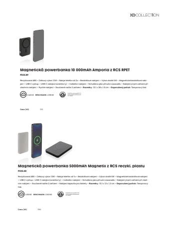 153Magnetick%u00e1 powerbanka 5000mAh Magnetix z RCS recykl. plastuP322.40Recyklovan%u00e1 ABS %u2022 Celkov%u00fd v%u00fdkon 12W %u2022 Nabije telefon a%u017e 1x %u2022 Bezdr%u00e1tov%u00e9 nab%u00edjen%u00ed %u2022 V%u00fdkon dra%u017e%u00e9 5W %u2022 Magnetick%u00e9 bezdr%u00e1tov%u00e9 nab%u00edjen%u00ed %u2022 USB C v%u00fdstup %u2022 USB-C nab%u00edjec%u00ed konektor(y) %u2022 Indik%u00e1tor nab%u00edjen%u00ed %u2022 Schv%u00e1leno jako p%u0159%u00edru%u010dn%u00ed zavazadlo %u2022 Nab%u00edjen%u00ed jin%u00fdch za%u0159%u00edzen%u00ed p%u0159i vlastn%u00edm nab%u00edjen%u00ed %u2022 Sou%u010dasn%u011b na%u010dte 2 za%u0159%u00edzen%u00ed %u2022 Nab%u00edjec%u00ed kapacita pro tablety %u2022 Rozm%u011bry: 10,1 x 12 x 1,2 cm %u2022 Doporu%u010den%u00fd potisk: Tamponov%u00fd tisk2.50 KG %u0009 BENCHMARK: 2.60 KG Pod%u00edl RCS recyklovan%u00e1 ABS: 20 %. CERTIFIKOV%u00c1NO KONTROLN%u00cd UNI%u00cd (CU 1162221)Cena (K%u010d) 590 Magnetick%u00e1 powerbanka 10 000mAh Amporia z RCS RPETP322.89Recyklovan%u00e1 ABS %u2022 Celkov%u00fd v%u00fdkon 12W %u2022 Nabije telefon a%u017e 2x %u2022 Bezdr%u00e1tov%u00e9 nab%u00edjen%u00ed %u2022 V%u00fdkon dra%u017e%u00e9 5W %u2022 Magnetick%u00e9 bezdr%u00e1tov%u00e9 nab%u00edjen%u00ed %u2022 USB C v%u00fdstup %u2022 USB-C nab%u00edjec%u00ed konektor(y) %u2022 Indik%u00e1tor nab%u00edjen%u00ed %u2022 Schv%u00e1leno jako p%u0159%u00edru%u010dn%u00ed zavazadlo %u2022 Nab%u00edjen%u00ed jin%u00fdch za%u0159%u00edzen%u00ed p%u0159i vlastn%u00edm nab%u00edjen%u00ed %u2022 Rychl%u00e9 nab%u00edjen%u00ed %u2022 Sou%u010dasn%u011b na%u010dte 2 za%u0159%u00edzen%u00ed %u2022 Rozm%u011bry: 10,1 x 28 x 1,9 cm %u2022 Doporu%u010den%u00fd potisk: Tamponov%u00fd tisk2.46 KG %u0009 BENCHMARK: 2.58 KG Pod%u00edl RCS recyklovan%u00e1 ABS: 15 %. CERTIFIKOV%u00c1NO KONTROLN%u00cd UNI%u00cd (CU 1162221)Cena (K%u010d) 720