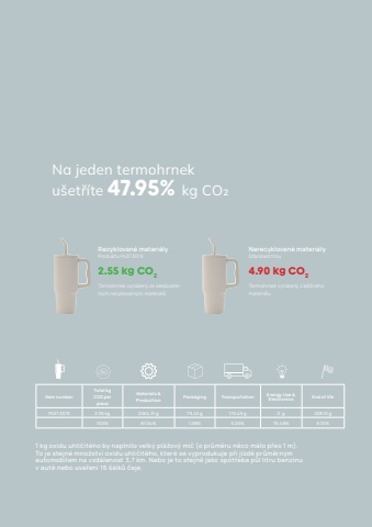 1 71 kg oxidu uhli%u010dit%u00e9ho by naplnilo velk%u00fd pl%u00e1%u017eov%u00fd m%u00ed%u010d (o pr%u016fm%u011bru n%u011bco m%u00e1lo p%u0159es 1 m). To je stejn%u00e9 mno%u017estv%u00ed oxidu uhli%u010dit%u00e9ho, kter%u00e9 se vyprodukuje p%u0159i j%u00edzd%u011b pr%u016fm%u011brn%u00fdm automobilem na vzd%u00e1lenost 3,7 km. Nebo je to stejn%u011b jako spot%u0159eba p%u016fl litru benz%u00ednu v aut%u011b nebo uva%u0159en%u00ed 16 %u0161%u00e1lk%u016f %u010daje.Recyklovan%u00e9 materi%u00e1lyProduktu P437.3019Nerecyklovan%u00e9 materi%u00e1lyStandard trhu2.55 kg CO2 4.90 kg CO2Termohrnek vyroben%u00fd ze sledovateln%u00fdch recyklovan%u00fdch materi%u00e1l%u016fTermohrnek vyroben%u00fd z b%u011b%u017en%u00e9ho materi%u00e1luNa jeden termohrnek u%u0161et%u0159%u00edte 47.95% kg CO2Item numberTotal kg CO2 per pieceMaterials & Production Packaging Transportation Energy Use & Electronics End of lifeP437.3019 2.55 kg 2064.31 g 79.43 g 175.49 g 0 g 228.16 g100% 81.04% 1.08% 5.25% 76.49% 6.10%