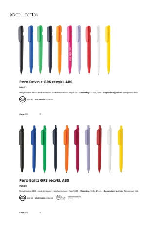 178your logo here Pero Bolt z GRS recykl. ABSP611.32Recyklovan%u00e1 ABS %u2022 modr%u00e1 inkoust %u2022 Mechanismus %u2022 N%u00e1pl%u0148 X20 %u2022 Rozm%u011bry: 13,9 x %u00d81 cm %u2022 Doporu%u010den%u00fd potisk: Tamponov%u00fd tisk0.02 KG %u0009 BENCHMARK: 0.04 KG Pod%u00edl GRS recyklovan%u00e1 ABS: 81 %. CERTIFIKOV%u00c1NO KONTROLN%u00cd UNI%u00cd (CU 1162221)Cena (K%u010d) 9 Pero Devin z GRS recykl. ABSP611.27Recyklovan%u00e1 ABS %u2022 modr%u00e1 inkoust %u2022 Mechanismus %u2022 N%u00e1pl%u0148 X20 %u2022 Rozm%u011bry: 14 x %u00d81,1 cm %u2022 Doporu%u010den%u00fd potisk: Tamponov%u00fd tisk0.02 KG %u0009 BENCHMARK: 0.06 KGCena (K%u010d) 13