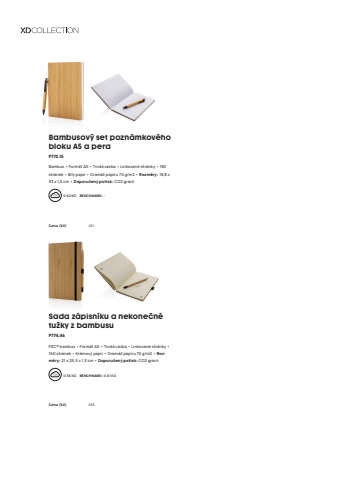 188Sada z%u00e1pisn%u00edku a nekone%u010dn%u00e9 tu%u017eky z bambusuP774.46FSC%u00ae bambus %u2022 Form%u00e1t A5 %u2022 Tvrd%u00e1 vazba %u2022 Linkovan%u00e9 str%u00e1nky %u2022 160 str%u00e1nek %u2022 Kr%u00e9mov%u00fd pap%u00edr %u2022 Gram%u00e1%u017e pap%u00edru 70 g/m2 %u2022 Rozm%u011bry: 21 x 25,5 x 1,3 cm %u2022 Doporu%u010den%u00fd potisk: CO2 grav%u00edr0.56 KG %u0009 BENCHMARK: 0.61 KGCena (K%u010d) 295 Bambusov%u00fd set pozn%u00e1mkov%u00e9ho bloku A5 a peraP772.15Bambus %u2022 Form%u00e1t A5 %u2022 Tvrd%u00e1 vazba %u2022 Linkovan%u00e9 str%u00e1nky %u2022 180 str%u00e1nek %u2022 B%u00edl%u00fd pap%u00edr %u2022 Gram%u00e1%u017e pap%u00edru 70 g/m2 %u2022 Rozm%u011bry: 18,8 x 33 x 1,5 cm %u2022 Doporu%u010den%u00fd potisk: CO2 grav%u00edr0.62 KG %u0009 BENCHMARK: -Cena (K%u010d) 261