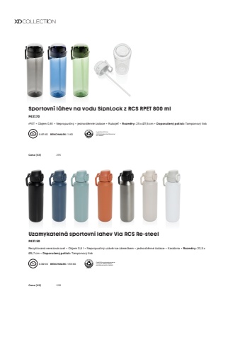 194Sportovn%u00ed l%u00e1hev na vodu SipnLock z RCS RPET 800 mlP437.70rPET %u2022 Objem 0,8 l %u2022 Nepropustn%u00fd %u2022 jednost%u011bnn%u00e9 izolace %u2022 Rukoje%u0165 %u2022 Rozm%u011bry: 25 x %u00d87,6 cm %u2022 Doporu%u010den%u00fd potisk: Tamponov%u00fd tisk0.87 KG %u0009 BENCHMARK: 1 KG Pod%u00edl RCS rPET: 55 %. CERTIFIKOV%u00c1NO KONTROLN%u00cd UNI%u00cd (CU 1162221)Cena (K%u010d) 295 Uzamykateln%u00e1 sportovn%u00ed lahev Via RCS Re-steelP437.50Recyklovan%u00e1 nerezov%u00e1 ocel %u2022 Objem 0,6 l %u2022 Nepropustn%u00fd uz%u00e1v%u011br se z%u00e1me%u010dkem %u2022 jednost%u011bnn%u00e9 izolace %u2022 Karabina %u2022 Rozm%u011bry: 23,5 x %u00d86,7 cm %u2022 Doporu%u010den%u00fd potisk: Tamponov%u00fd tisk0.82 KG %u0009 BENCHMARK: 1.55 KG Pod%u00edl RCS recyklovan%u00e1 nerezov%u00e1 ocel: 67 %. CERTIFIKOV%u00c1NO KONTROLN%u00cd UNI%u00cd (CU 1162221)Cena (K%u010d) 228