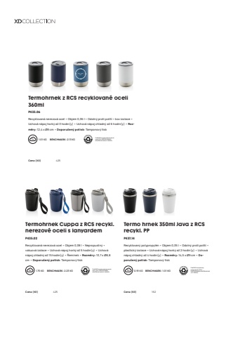 206your logo hereTermohrnek Cuppa z RCS recykl. nerezov%u00e9 oceli s lanyardemP435.02Recyklovan%u00e1 nerezov%u00e1 ocel %u2022 Objem 0,38 l %u2022 Nepropustn%u00fd %u2022 vakuov%u00e1 izolace %u2022 Uchov%u00e1 n%u00e1poj hork%u00fd a%u017e 5 hodin(y) %u2022 Uchov%u00e1 n%u00e1poj chladn%u00fd a%u017e 15 hodin(y) %u2022 %u0158em%u00ednek %u2022 Rozm%u011bry: 13,7 x %u00d88,8 cm %u2022 Doporu%u010den%u00fd potisk: Tamponov%u00fd tisk1.75 KG %u0009 BENCHMARK: 2.23 KG Pod%u00edl RCS recyklovan%u00e1 nerezov%u00e1 ocel: 74 %. CERTIFIKOV%u00c1NO KONTROLN%u00cd UNI%u00cd (CU 1162221)Cena (K%u010d) 425 Termohrnek z RCS recyklovan%u00e9 oceli 360mlP433.06Recyklovan%u00e1 nerezov%u00e1 ocel %u2022 Objem 0,36 l %u2022 Odoln%u00fd proti polit%u00ed %u2022 kov izolace %u2022 Uchov%u00e1 n%u00e1poj hork%u00fd a%u017e 3 hodin(y) %u2022 Uchov%u00e1 n%u00e1poj chladn%u00fd a%u017e 6 hodin(y) %u2022 Rozm%u011bry: 12,4 x %u00d88 cm %u2022 Doporu%u010den%u00fd potisk: Tamponov%u00fd tisk1.01 KG %u0009 BENCHMARK: 2.13 KG Pod%u00edl RCS recyklovan%u00e1 nerezov%u00e1 ocel: 76 %. CERTIFIKOV%u00c1NO KONTROLN%u00cd UNI%u00cd (CU 1162221)Cena (K%u010d) 425 Termo hrnek 350ml Java z RCS recykl. PPP437.14Recyklovan%u00fd polypropyl%u00e9n %u2022 Objem 0,35 l %u2022 Odoln%u00fd proti polit%u00ed %u2022 plastick%u00fd izolace %u2022 Uchov%u00e1 n%u00e1poj hork%u00fd a%u017e 2 hodin(y) %u2022 Uchov%u00e1 n%u00e1poj chladn%u00fd a%u017e 4 hodin(y) %u2022 Rozm%u011bry: 14,5 x %u00d89 cm %u2022 Doporu%u010den%u00fd potisk: Tamponov%u00fd tisk0.91 KG %u0009 BENCHMARK: 1.01 KGPod%u00edl RCS recyklovan%u00fd polypropyl%u00e9n: 36 %. CERTIFIKOV%u00c1NO KONTROLN%u00cd UNI%u00cd (CU 1162221)Cena (K%u010d) 162