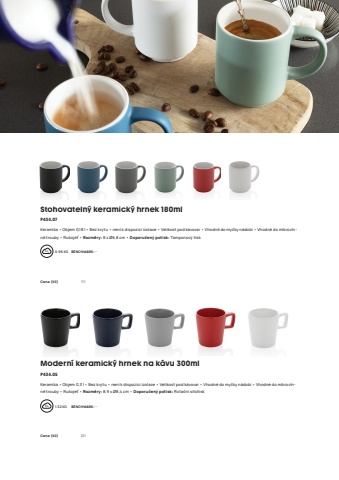 210Stohovateln%u00fd keramick%u00fd hrnek 180mlP434.07Keramika %u2022 Objem 0,18 l %u2022 Bez krytu %u2022 nen%u00ed k dispozici izolace %u2022 Velikost pod k%u00e1vovar %u2022 Vhodn%u00e9 do my%u010dky n%u00e1dob%u00ed %u2022 Vhodn%u00e9 do mikrovlnn%u00e9 trouby %u2022 Rukoje%u0165 %u2022 Rozm%u011bry: 8 x %u00d86,8 cm %u2022 Doporu%u010den%u00fd potisk: Tamponov%u00fd tisk0.96 KG %u0009 BENCHMARK: -Cena (K%u010d) 111 Modern%u00ed keramick%u00fd hrnek na k%u00e1vu 300mlP434.05Keramika %u2022 Objem 0,3 l %u2022 Bez krytu %u2022 nen%u00ed k dispozici izolace %u2022 Velikost pod k%u00e1vovar %u2022 Vhodn%u00e9 do my%u010dky n%u00e1dob%u00ed %u2022 Vhodn%u00e9 do mikrovlnn%u00e9 trouby %u2022 Rukoje%u0165 %u2022 Rozm%u011bry: 8,9 x %u00d88,4 cm %u2022 Doporu%u010den%u00fd potisk: Rota%u010dn%u00ed s%u00edtotisk1.32 KG %u0009 BENCHMARK: -Cena (K%u010d) 121