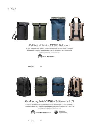 224your logo here Cyklistick%u00e1 bra%u0161na VINGA Baltimore501819 %u010dern%u00e1 %u2022 501818 zelen%u00e1 %u2022 501821 n%u00e1mo%u0159n%u00ed mod%u0159 %u2022501820 greige %u2022 Polyester %u2022 Objem 23 l %u2022 Odd%u00edl na notebook/tablet o vel. 16%u201d %u2022 Rozm%u011bry: 30 x 40 x 40 cm %u2022 Doporu%u010den%u00fd potisk: Transferov%u00fd tisk7.89 KG%u0009 BENCHMARK: -Cena (K%u010d) 1310 Outdoorov%u00fd batoh VINGA Baltimore z RCSV7750101 %u010dern%u00e1 %u2022 V7750107 zelen%u00e1 %u2022 V7750125 n%u00e1mo%u0159n%u00ed mod%u0159 %u2022 V7750119 greige %u2022 Polyester %u2022 Objem 33 l %u2022 Odd%u00edl na notebook/tablet o vel. 15,6%u201d %u2022 Rozm%u011bry: 30 x 38,9 x 48 cm %u2022 Doporu%u010den%u00fd potisk: Transferov%u00fd tisk10.04 KG %u0009BENCHMARK: 11.47 KG Pod%u00edl RCS polyester: 16 %. CERTIFIKOV%u00c1NO KONTROLN%u00cd UNI%u00cd (CU 1162221)Cena (K%u010d) 1865