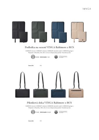 231Piknikov%u00e1 deka VINGA Baltimore z RCSV4590301 %u010dern%u00e1 %u2022 V4590327 zelen%u00e1 %u2022 V4590325 n%u00e1mo%u0159n%u00ed mod%u0159 %u2022 V4590319 greige %u2022 Polyester %u2022 Rozm%u011bry: 150 x 34 x 0 cm %u2022 Doporu%u010den%u00fd potisk: Transferov%u00fd tisk3.74 KG %u0009 BENCHMARK: 6.14 KG Pod%u00edl RCS recyklovan%u00fd polyester: 47 %. CERTIFIKOV%u00c1NO KONTROLN%u00cd UNI%u00cd (CU 1162221)Cena (K%u010d) 815 Podlo%u017eka na sezen%u00ed VINGA Baltimore z RCSV4590401 %u010dern%u00e1 %u2022 V4590407 zelen%u00e1 %u2022 V4590425 n%u00e1mo%u0159n%u00ed mod%u0159 %u2022 V4590419 greige %u2022 Polyester %u2022 Rozm%u011bry: 40 x 36 x 1,5 cm %u2022 Doporu%u010den%u00fd potisk: Transferov%u00fd tisk0.85 KG %u0009 BENCHMARK: 1 KG Pod%u00edl RCS recyklovan%u00fd polyester: 24 %. CERTIFIKOV%u00c1NO KONTROLN%u00cd UNI%u00cd (CU 1162221)Cena (K%u010d) 254