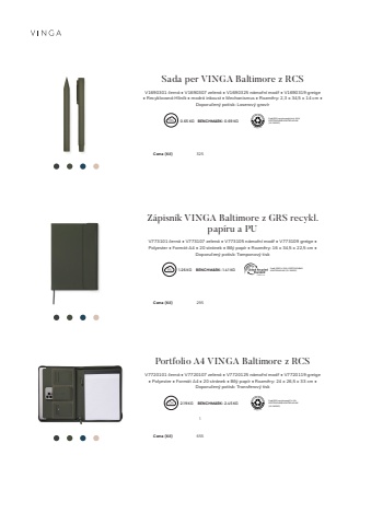 232Portfolio A4 VINGA Baltimore z RCSV7720101 %u010dern%u00e1 %u2022 V7720107 zelen%u00e1 %u2022 V7720125 n%u00e1mo%u0159n%u00ed mod%u0159 %u2022 V7720119 greige %u2022 Polyester %u2022 Form%u00e1t A4 %u2022 20 str%u00e1nek %u2022 B%u00edl%u00fd pap%u00edr %u2022 Rozm%u011bry: 24 x 26,5 x 33 cm %u2022 Doporu%u010den%u00fd potisk: Transferov%u00fd tisk2.19 KG %u0009 BENCHMARK: 2.45 KG Pod%u00edl RCS recyklovan%u00e1 PU: 6 %. CERTIFIKOV%u00c1NO KONTROLN%u00cd UNI%u00cd (CU 1162221)1Cena (K%u010d) 655 Sada per VINGA Baltimore z RCSV1690301 %u010dern%u00e1 %u2022 V1690307 zelen%u00e1 %u2022 V1690325 n%u00e1mo%u0159n%u00ed mod%u0159 %u2022 V1690319 greige %u2022 Recyklovan%u00e1 Hlin%u00edk %u2022 modr%u00e1 inkoust %u2022 Mechanismus %u2022 Rozm%u011bry: 2,3 x 34,5 x 14 cm %u2022 Doporu%u010den%u00fd potisk: Laserov%u00fd grav%u00edr0.65 KG %u0009 BENCHMARK: 0.69 KG Pod%u00edl RCS recyklovan%u00e1 hlin%u00edk: 62 %. CERTIFIKOV%u00c1NO KONTROLN%u00cd UNI%u00cd (CU 1162221)Cena (K%u010d) 325 Z%u00e1pisn%u00edk VINGA Baltimore z GRS recykl. pap%u00edru a PUV773101 %u010dern%u00e1 %u2022 V773107 zelen%u00e1 %u2022 V773105 n%u00e1mo%u0159n%u00ed mod%u0159 %u2022 V773109 greige %u2022 Polyester %u2022 Form%u00e1t A4 %u2022 20 str%u00e1nek %u2022 B%u00edl%u00fd pap%u00edr %u2022 Rozm%u011bry: 16 x 34,5 x 22,5 cm %u2022 Doporu%u010den%u00fd potisk: Tamponov%u00fd tisk1.26 KG %u0009 BENCHMARK: 1.41 KG Pod%u00edl GRS PU: 59 %. CERTIFIKOV%u00c1NO KONTROLN%u00cd UNI%u00cd (CU 1162221)Cena (K%u010d) 295