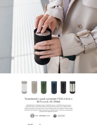 246Termohrnek s push zav%u00edr%u00e1n%u00edm VINGA Erie z RCS recyk. SS 350mlV4321003 b%u00edl%u00e1 %u2022 V4321012 %u0161ed%u00e1 %u2022 V4321007 zelen%u00e1 %u2022 V4321005 n%u00e1mo%u0159n%u00ed mod%u0159 %u2022 V4321001 %u010dern%u00e1 %u2022 V4321002 st%u0159%u00edbrn%u00e1 %u2022 Recyklovan%u00e1 nerezov%u00e1 ocel %u2022 Objem 0,35 l %u2022 Odoln%u00fd proti polit%u00ed %u2022 vakuov%u00e1 izolace %u2022 Uchov%u00e1 n%u00e1poj hork%u00fd a%u017e 5 hodin(y) %u2022 Uchov%u00e1 n%u00e1poj chladn%u00fd a%u017e 15 hodin(y) %u2022 Velikost pod k%u00e1vovar %u2022 Rozm%u011bry: 16,2 x %u00d87,5 cm %u2022 Doporu%u010den%u00fd potisk: Rota%u010dn%u00ed digit%u00e1ln%u00ed tisk 360%u00b01.39 KG %u0009 BENCHMARK: 2.45 KG Pod%u00edl RCS recyklovan%u00e1 nerezov%u00e1 ocel: 58 %. CERTIFIKOV%u00c1NO KONTROLN%u00cd UNI%u00cd (CU 1162221)Cena (K%u010d) 525