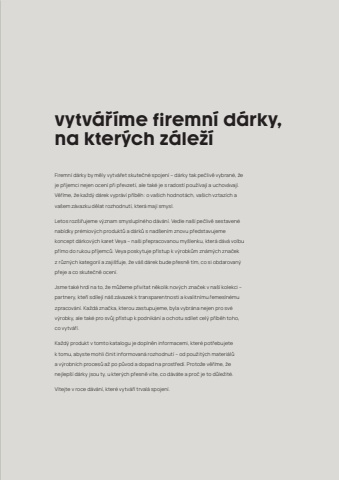 3Firemn%u00ed d%u00e1rky by m%u011bly vytv%u00e1%u0159et skute%u010dn%u00e9 spojen%u00ed %u2013 d%u00e1rky tak pe%u010dliv%u011b vybran%u00e9, %u017ee je p%u0159%u00edjemci nejen ocen%u00ed p%u0159i p%u0159evzet%u00ed, ale tak%u00e9 je s radost%u00ed pou%u017e%u00edvaj%u00ed a uchov%u00e1vaj%u00ed. V%u011b%u0159%u00edme, %u017ee ka%u017ed%u00fd d%u00e1rek vypr%u00e1v%u00ed p%u0159%u00edb%u011bh: o va%u0161ich hodnot%u00e1ch, va%u0161ich vztaz%u00edch a va%u0161em z%u00e1vazku d%u011blat rozhodnut%u00ed, kter%u00e1 maj%u00ed smysl.Letos roz%u0161i%u0159ujeme v%u00fdznam smyslupln%u00e9ho d%u00e1v%u00e1n%u00ed. Vedle na%u0161%u00ed pe%u010dliv%u011b sestaven%u00e9 nab%u00eddky pr%u00e9miov%u00fdch produkt%u016f a d%u00e1rk%u016f s nad%u0161en%u00edm znovu p%u0159edstavujeme koncept d%u00e1rkov%u00fdch karet Veya %u2013 na%u0161i p%u0159epracovanou my%u0161lenku, kter%u00e1 d%u00e1v%u00e1 volbu p%u0159%u00edmo do rukou p%u0159%u00edjemc%u016f. Veya poskytuje p%u0159%u00edstup k v%u00fdrobk%u016fm zn%u00e1m%u00fdch zna%u010dek z r%u016fzn%u00fdch kategori%u00ed a zaji%u0161%u0165uje, %u017ee v%u00e1%u0161 d%u00e1rek bude p%u0159esn%u011b t%u00edm, co si obdarovan%u00fd p%u0159eje a co skute%u010dn%u011b ocen%u00ed.Jsme tak%u00e9 hrd%u00ed na to, %u017ee m%u016f%u017eeme p%u0159iv%u00edtat n%u011bkolik nov%u00fdch zna%u010dek v na%u0161%u00ed kolekci %u2013 partnery, kte%u0159%u00ed sd%u00edlej%u00ed n%u00e1%u0161 z%u00e1vazek k transparentnosti a kvalitn%u00edmu %u0159emesln%u00e9mu zpracov%u00e1n%u00ed. Ka%u017ed%u00e1 zna%u010dka, kterou zastupujeme, byla vybr%u00e1na nejen pro sv%u00e9 v%u00fdrobky, ale tak%u00e9 pro sv%u016fj p%u0159%u00edstup k podnik%u00e1n%u00ed a ochotu sd%u00edlet cel%u00fd p%u0159%u00edb%u011bh toho, co vytv%u00e1%u0159%u00ed.Ka%u017ed%u00fd produkt v tomto katalogu je dopln%u011bn informacemi, kter%u00e9 pot%u0159ebujete k tomu, abyste mohli %u010dinit informovan%u00e1 rozhodnut%u00ed %u2013 od pou%u017eit%u00fdch materi%u00e1l%u016f a v%u00fdrobn%u00edch proces%u016f a%u017e po p%u016fvod a dopad na prost%u0159ed%u00ed. Proto%u017ee v%u011b%u0159%u00edme, %u017ee nejlep%u0161%u00ed d%u00e1rky jsou ty, u kter%u00fdch p%u0159esn%u011b v%u00edte, co d%u00e1v%u00e1te a pro%u010d je to d%u016fle%u017eit%u00e9.V%u00edtejte v roce d%u00e1v%u00e1n%u00ed, kter%u00e9 vytv%u00e1%u0159%u00ed trval%u00e1 spojen%u00ed.vytv%u00e1%u0159%u00edme firemn%u00ed d%u00e1rky, na kter%u00fdch z%u00e1le%u017e%u00ed