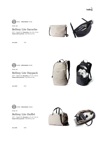 3 7P763.37Bellroy Lite DuffelrPET %u2022 Objem 30 l Rozm%u011bry: 40 x 51 x 33 cm Doporu%u010den%u00fd potisk: Transferov%u00fd tiskCena (K%u010d) 3300 4.93 KG%u0009 BENCHMARK: 7.20 KGP763.36Bellroy Lite DaypackrPET %u2022 Objem 20 l Rozm%u011bry: 27 x 51 x 48 cm Doporu%u010den%u00fd potisk: Transferov%u00fd tiskCena (K%u010d) 2475 4.56 KG%u0009 BENCHMARK: 5.51 KGP763.38Bellroy Lite SacocherPET %u2022 Objem 3,5 l Rozm%u011bry: 24 x 35 x 19 cm Doporu%u010den%u00fd potisk: Transferov%u00fd tiskCena (K%u010d) 1375 1.18 KG%u0009 BENCHMARK: 1.51 KG
