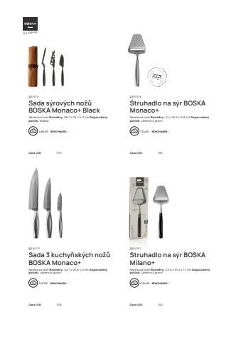 5 4RB3070Sada s%u00fdrov%u00fdch no%u017e%u016f BOSKA Monaco+ BlackNerezov%u00e1 ocel Rozm%u011bry: 28,7 x 16 x 5,3 cm Doporu%u010den%u00fd potisk: Ra%u017eba4.80 KG%u0009 BENCHMARK: -Cena (K%u010d) 1375 RB30708Struhadlo na s%u00fdr BOSKA Monaco+Nerezov%u00e1 ocel Rozm%u011bry: 21 x 10,6 x 0,9 cm Doporu%u010den%u00fd potisk: Laserov%u00fd grav%u00edr1.34 KG%u0009 BENCHMARK: -Cena (K%u010d) 355 RB30713Sada 3 kuchy%u0148sk%u00fdch no%u017e%u016f BOSKA Monaco+Nerezov%u00e1 ocel Rozm%u011bry: 32,7 x 21,6 x 2 cm Doporu%u010den%u00fd potisk: Laserov%u00fd grav%u00edr5.21 KG%u0009 BENCHMARK: -Cena (K%u010d) 1100 RB30741Struhadlo na s%u00fdr BOSKA Milano+Nerezov%u00e1 ocel Rozm%u011bry: 23,5 x 31,5 x 1,1 cm Doporu%u010den%u00fd potisk: Laserov%u00fd grav%u00edr0.54 KG%u0009 BENCHMARK: -Cena (K%u010d) 300