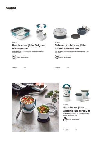 6 2your logo hereP439.03N%u00e1doba na j%u00eddlo Original Black+BlumPP Rozm%u011bry: 12,1 x 27 x 20,8 cm Doporu%u010den%u00fd potisk: Tamponov%u00fd tisk2.11 KG%u0009 BENCHMARK: -Cena (K%u010d) 685 P439.04Sklen%u011bn%u00e1 miska na j%u00eddlo 750ml Black+BlumSklo Rozm%u011bry: 14 x 32,5 x 8 cm Doporu%u010den%u00fd potisk: Laserov%u00fd grav%u00edr2.48 KG%u0009 BENCHMARK: -Cena (K%u010d) 825 P439.02Krabi%u010dka na j%u00eddlo Original Black+BlumPP Rozm%u011bry: 19,8 x 22,5 x 5,6 cm Doporu%u010den%u00fd potisk:Tamponov%u00fd tisk2.92 KG%u0009 BENCHMARK: -Cena (K%u010d) 660