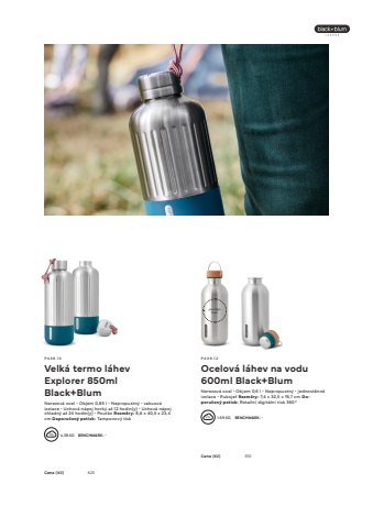 6 5your logo hereP439.13Velk%u00e1 termo l%u00e1hev Explorer 850ml Black+BlumNerezov%u00e1 ocel %u2022 Objem 0,85 l %u2022 Nepropustn%u00fd %u2022 vakuov%u00e1 izolace %u2022 Uchov%u00e1 n%u00e1poj hork%u00fd a%u017e 12 hodin(y) %u2022 Uchov%u00e1 n%u00e1poj chladn%u00fd a%u017e 24 hodin(y) %u2022 Poutko Rozm%u011bry: 8,6 x 40,5 x 23,4 cm Doporu%u010den%u00fd potisk: Tamponov%u00fd tisk4.38 KG%u0009 BENCHMARK: -Cena (K%u010d) 825 P439.12Ocelov%u00e1 l%u00e1hev na vodu 600ml Black+BlumNerezov%u00e1 ocel %u2022 Objem 0,6 l %u2022 Nepropustn%u00fd %u2022 jednost%u011bnn%u00e9 izolace %u2022 Rukoje%u0165 Rozm%u011bry: 7,4 x 32,5 x 19,7 cm Doporu%u010den%u00fd potisk: Rota%u010dn%u00ed digit%u00e1ln%u00ed tisk 360%u00b01.69 KG%u0009 BENCHMARK: -Cena (K%u010d) 355