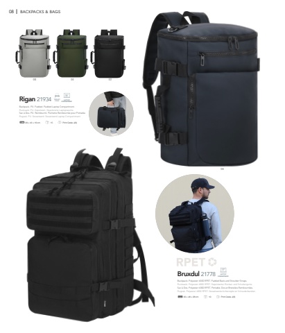08 I BACKPACKS & BAGSRigan 21934 TROLLEY STRAP04 020608LAPTOPCOMPARTMENT15%u201d29 %u00d7 43 %u00d7 16 cm 15 Print Code: J(8)Bruxdul 21778 LAPTOPCOMPARTMENT17%u201d30 %u00d7 48 %u00d7 28 cm 10 Print Code: J(8)Backpack. Polyester 600D RPET. Padded Back and Shoulder Straps.Rucksack. Polyester 600D RPET. Gepolsterter R%u00fccken und Schultergurte.Sac %u00e0 Dos. Polyester 600D RPET. Portable. Dos et Bretelles Rembourr%u00e9es.Rugzak. Polyester 600D RPET. Gewatteerde Achterzijde en Schouderbanden.Backpack. PU. Padded. Padded Laptop Compartment.Rucksack. PU. Gepolstert. Gepolsterte Laptoptasche.Sac %u00e0 Dos. PU. Rembourr%u00e9. Pochette Rembourr%u00e9e pour Portable.Rugzak. PU. Gewatteerd. Gewatteerd Laptop Compartiment.