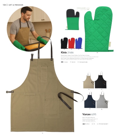 104 I GIFT & PREMIUMSVurcex 629568 %u00d7 80 cm 50 Print Code: G(4), N(8), PKinix 2168602 03041917 %u00d7 28 cm 200 / 25 Print Code: F(1), N(8)Kitchen Mitten. Organic Cotton/ Rubber. One Flat Side for Printing.K%u00fcchenhandschuh. Organische Baumwolle/ Gummi. Eine Flache Seite zum Bedrucken.Gant Cuisine. Coton Organique/ Caoutchouc. Un C%u00f4t%u00e9 Lisse pour Impression.Ovenwant. Organisch Katoen/ Rubber. E%u00e9n Platte Zijde Voor Bedrukking.Apron. PU/ Cotton 340 g/ m2.Sch%u00fcrze. PU/ Baumwolle 340 g/ m2.Tablier. PU/ Coton 340 g/ m2.Schort. PU/ Katoen 340 g/ m2.