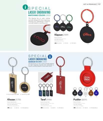 This Keyring has an outer coating specially designed for laser engraving, ensuring your advertising or brand is correctly marked in matching color.B- 2,6 X 5,8 X 0,5 CM A- %u00d8 4 X 0,5 CMThis Keyring has an outer coating specially designed for laser engraving, ensuring your advertising or brand is correctly marked in a mirror silver colour.GIFT & PREMIUMS I 107Klapson 21891%u00d8 4.2 %u00d7 0.2 cm 300 / 50 Print Code: L1Khozax 21750Consult. 500 / 50 Print Code: D(1), L1Taraf 21904227 020319 063.2 %u00d7 5.2 %u00d7 0.1 cm 500 / 50 Print Code: L1Puckler 2201002 010306 18 195 %u00d7 8.5 %u00d7 0.3 cm 500 / 50 Print Code: D(4), L1Keyring. PU/ Metal.Schl%u00fcsselanh%u00e4nger. PU/ Metall.Porte-Cl%u00e9s. PU/ M%u00e9tal.Sleutelhanger. PU/ Metaal.Keyring. Stainless Steel.Schl%u00fcsselanh%u00e4nger. Rostfreier Stahl.Porte-Cl%u00e9s. Acier Inox.Sleutelhanger. Roestvrij Staal.Keyring. Metal/ Bamboo.Schl%u00fcsselanh%u00e4nger. Metall/ Bambus.Porte-Cl%u00e9s. M%u00e9tal/ Bambou.Sleutelhanger. Metaal/ Bamboe.Keyring. Aluminium.Schl%u00fcsselanh%u00e4nger. Aluminium.Porte-Cl%u00e9s. Aluminium.Sleutelhanger. Aluminium.