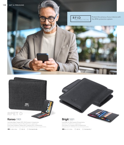 Protect the privacy of your device with the RFID protection system.108 I GIFT & PREMIUMSKenxo 190111 %u00d7 8.6 %u00d7 1.3 cm 200 / 50 Print Code: E(1), N(8)Brigit 52218.2 %u00d7 11.7 %u00d7 1.5 cm 200 / 50 Print Code: D(1), TCard Holder. PU. RFID Protected. 8 Compartments.Kartenetui. PU. RFID Schutz. 8 Abteilungen.Porte-Cartes. PU. Protecteur RFID. 8 Compartiments.Kaartjeshouder. PU. RFID Bescherming. 8 Compartimenten.Card Holder Wallet. Polyester RPET. RFID Protected. 6 Compartments.Kartenetui Brieftasche. Polyester RPET. RFID Schutz. 6 Abteilungen.Porte-Cartes Portefeuille. Polyester RPET. Protecteur RFID. 6 Compartiments.Kaartjeshouder Portemonnee. Polyester RPET. RFID Bescherming. 6 Compartimenten.